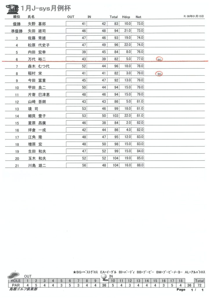 1月 J-sys月例杯 結果