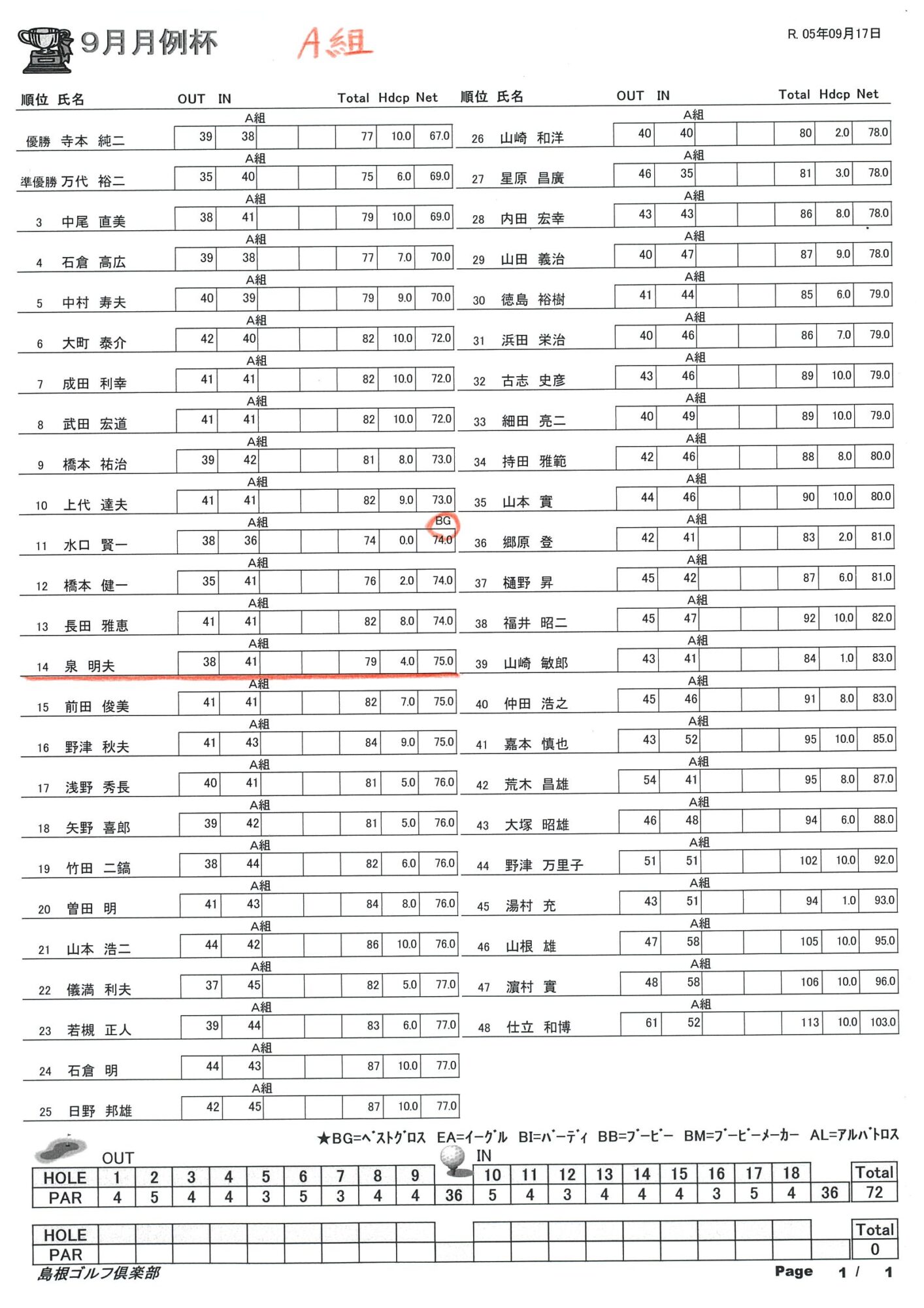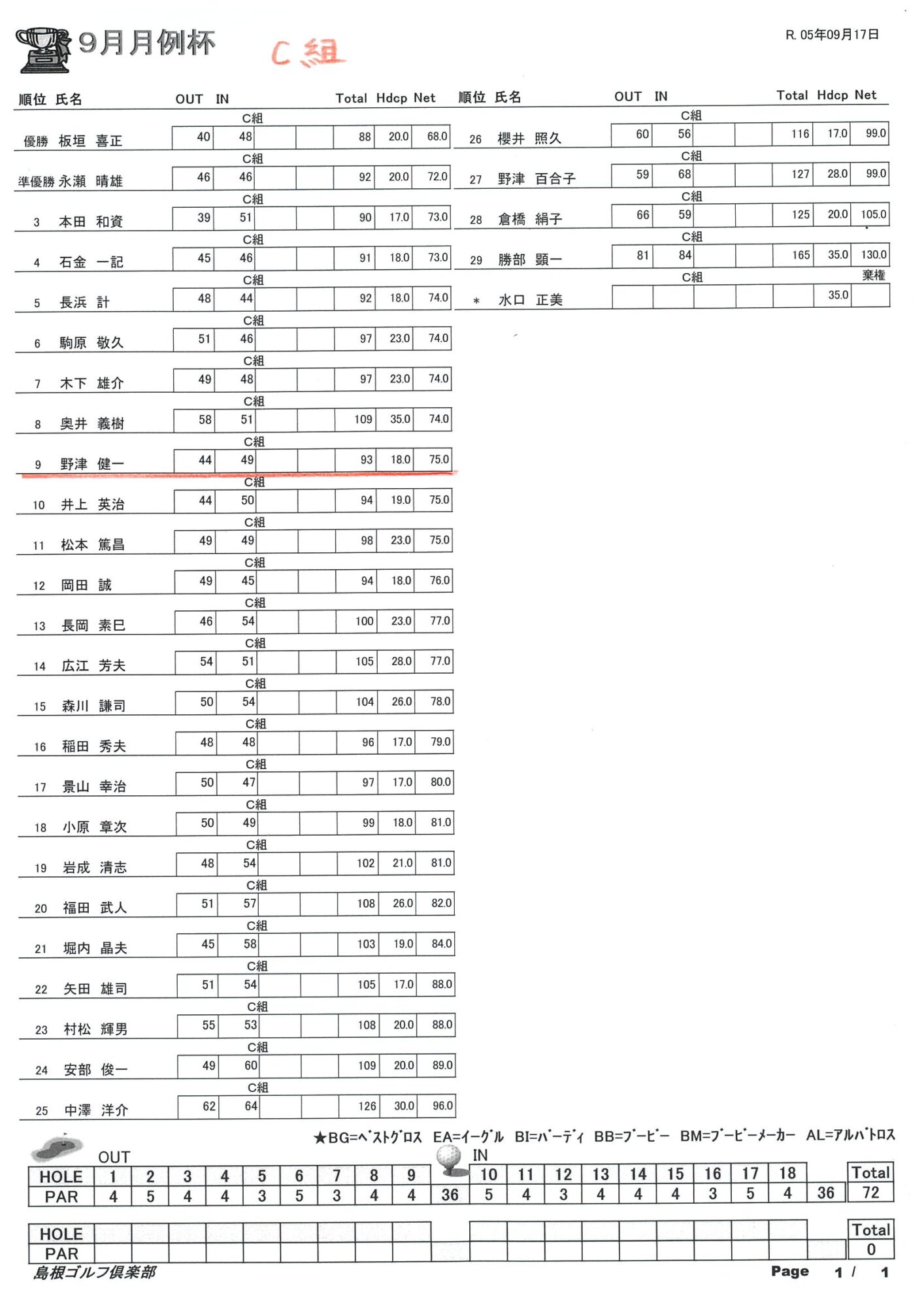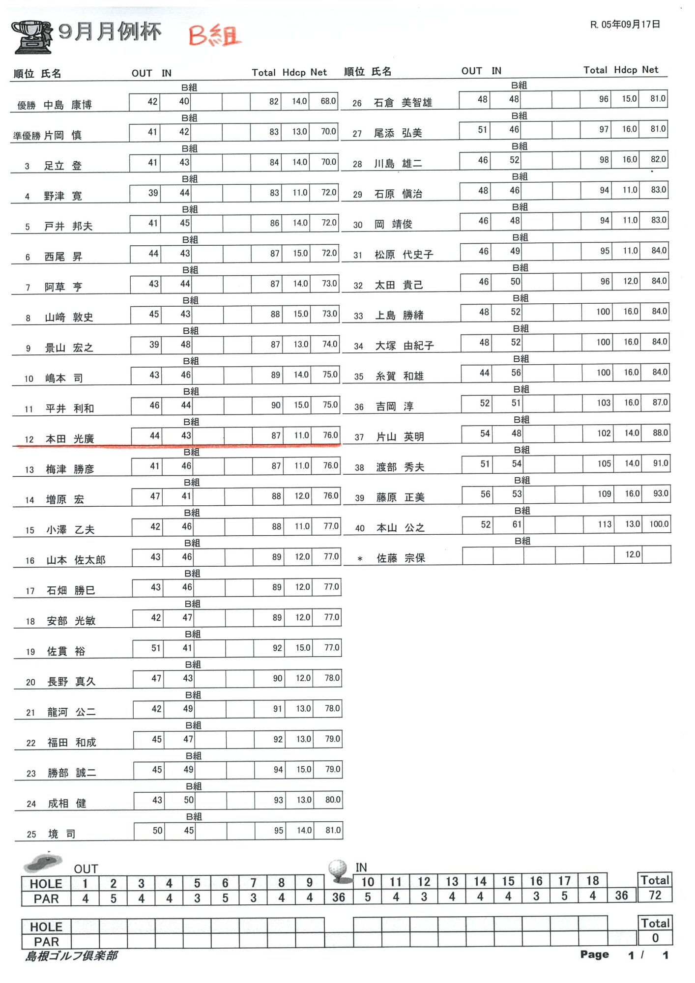 9月月例杯結果になります。