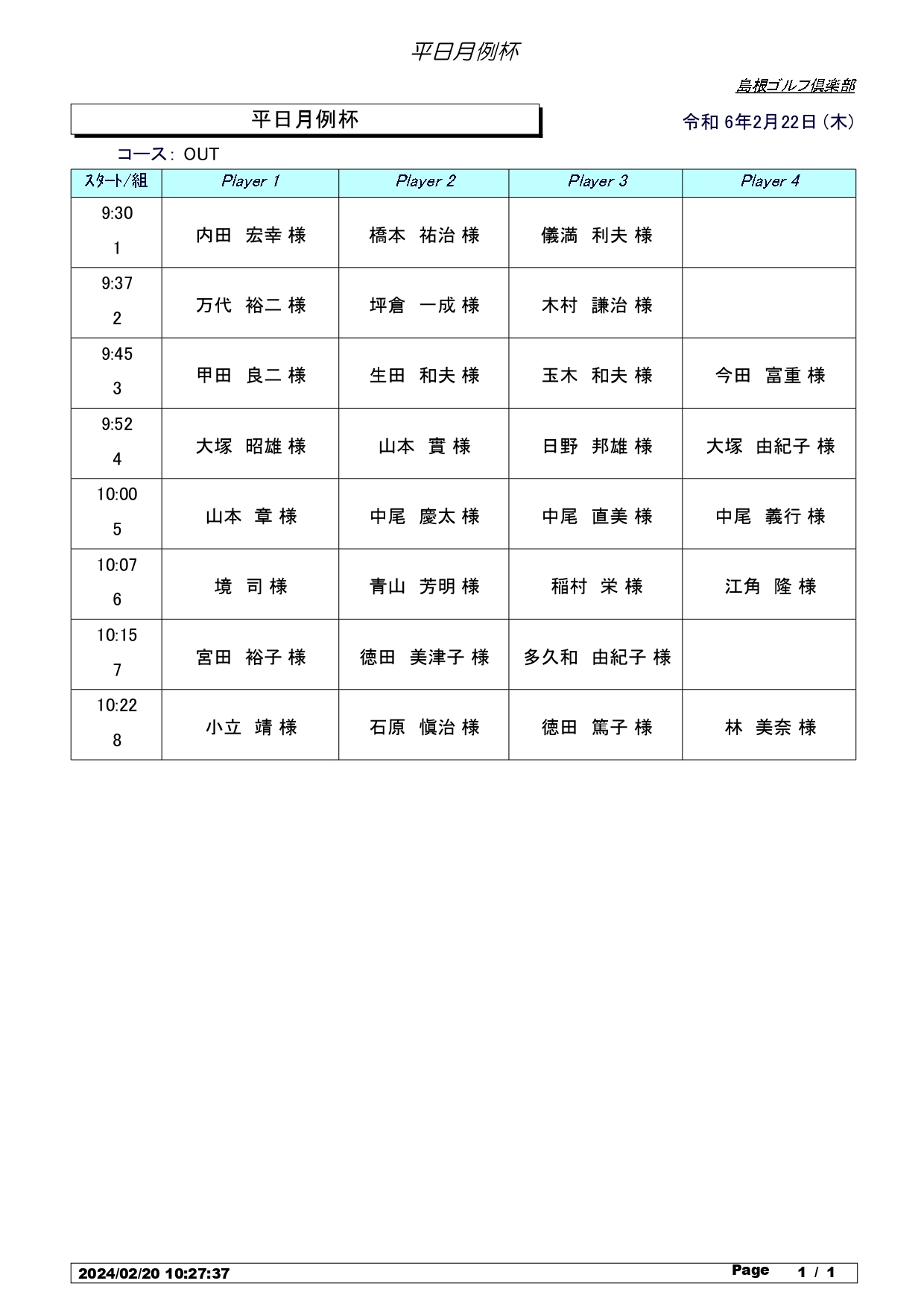2月 平日月例杯 組合せ