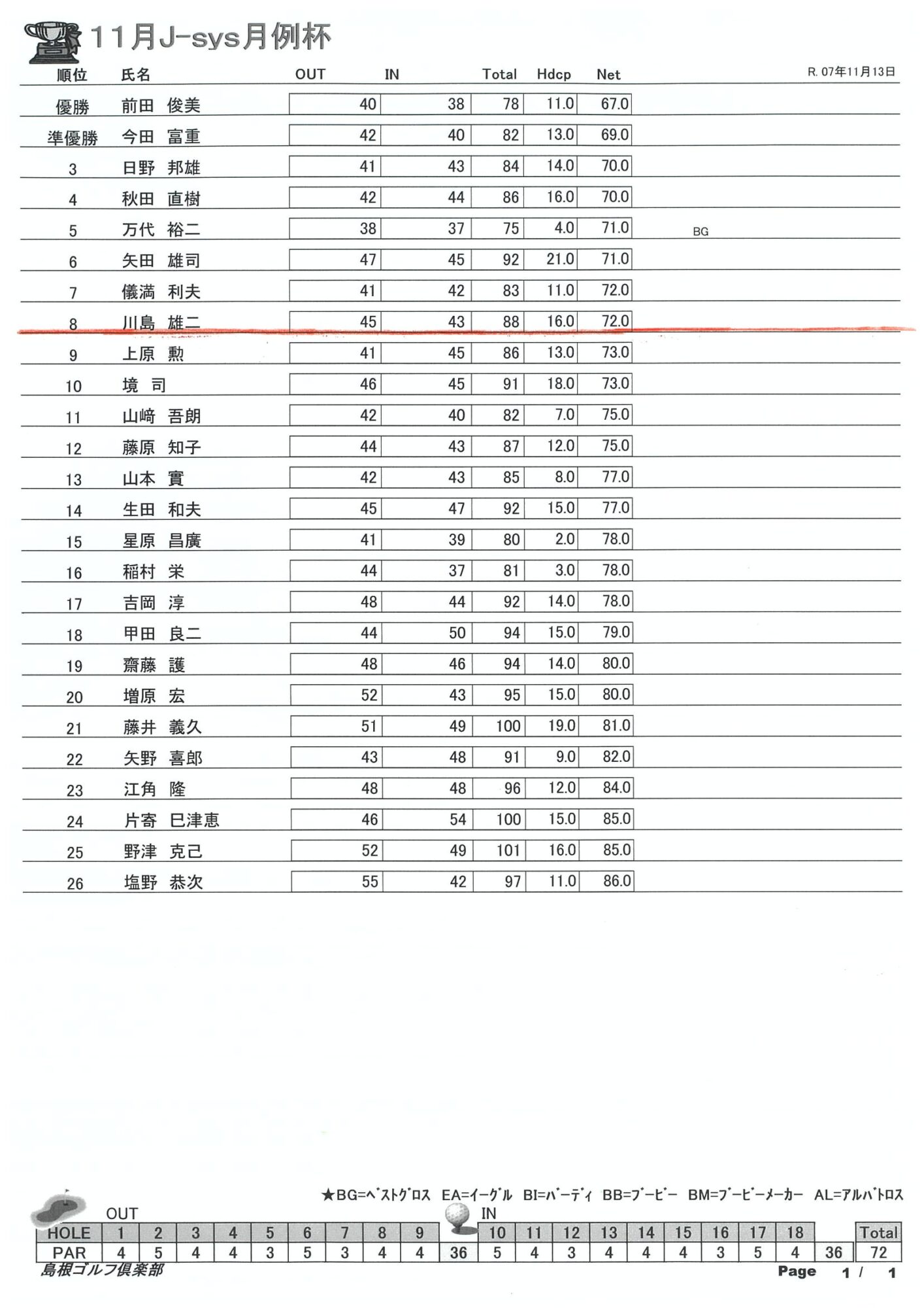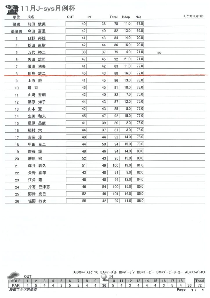 11月 J-sys月例杯 結果