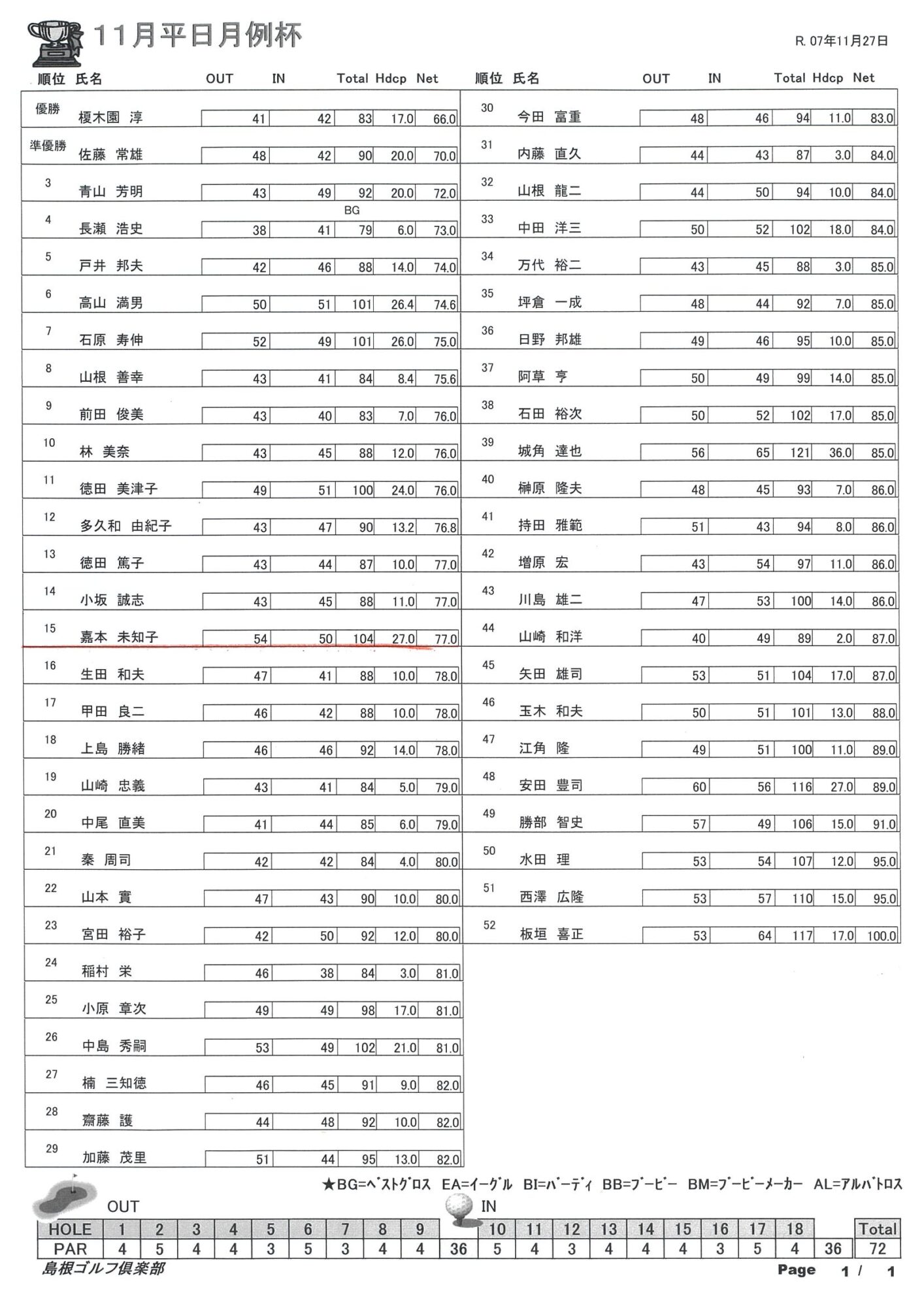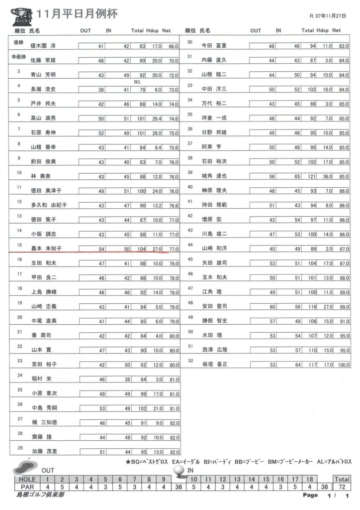 11月平日月例杯結果