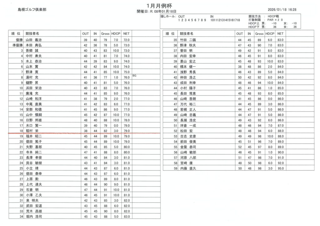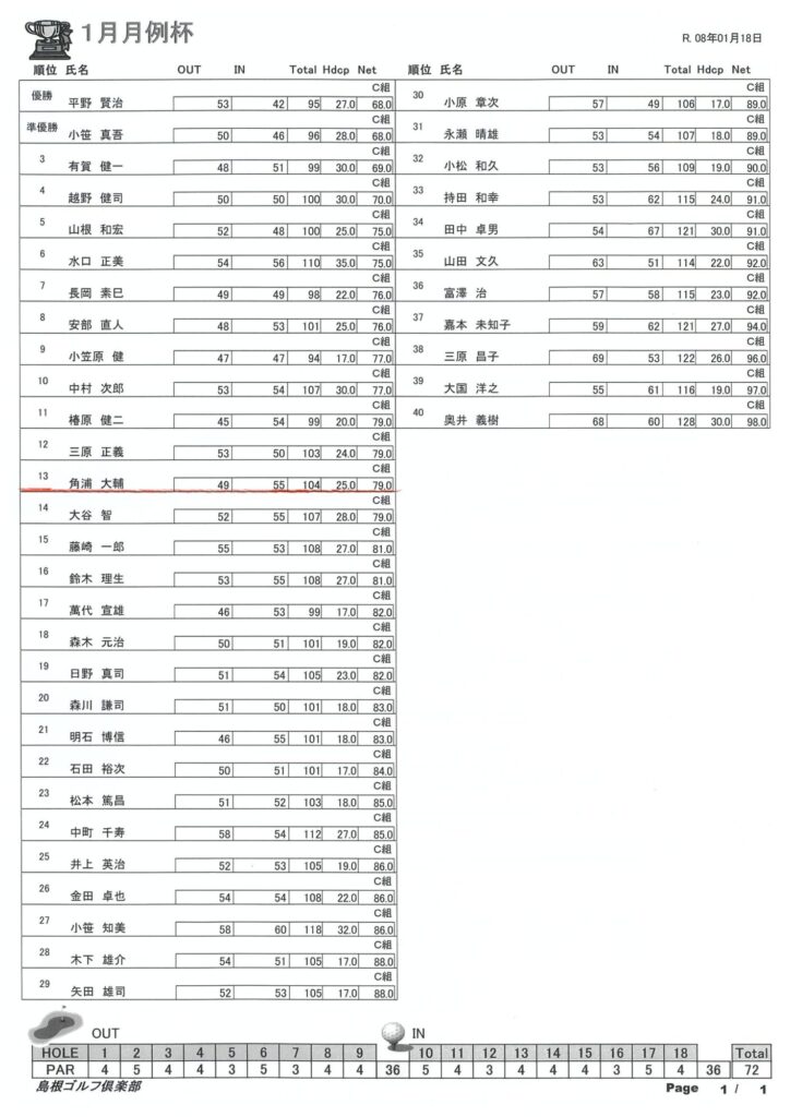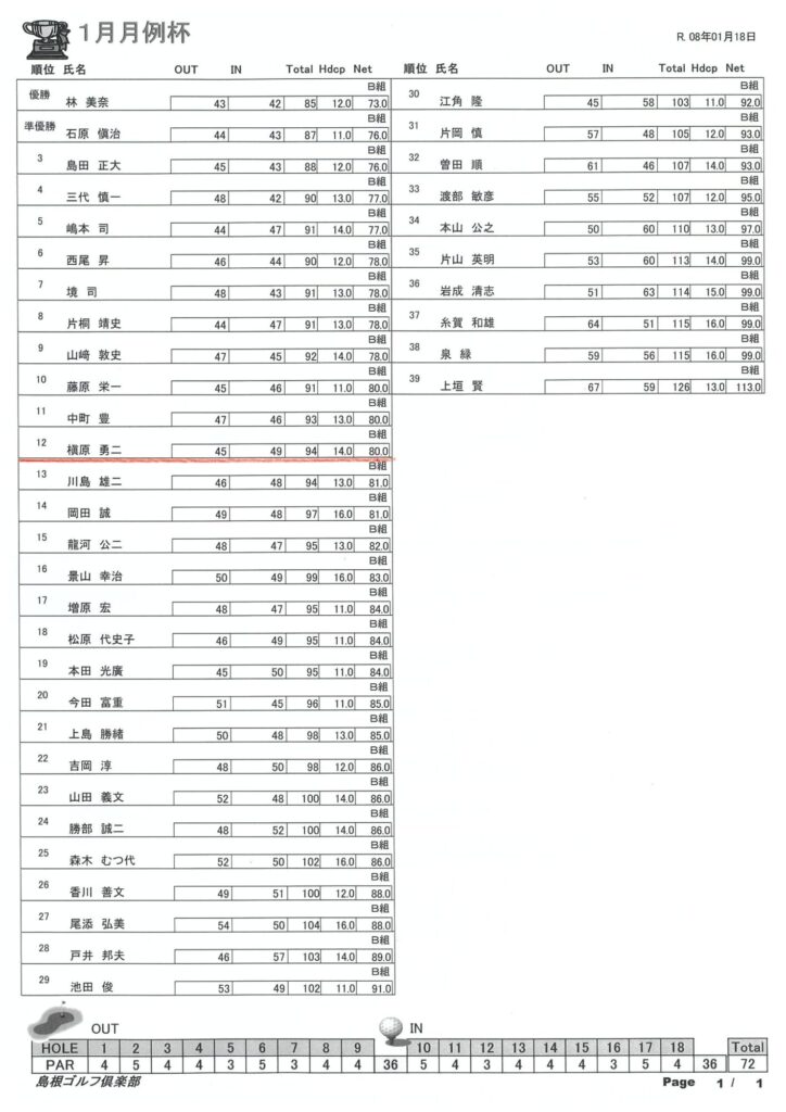 1月 月例杯 結果