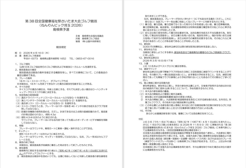 「第38回 全国健康福祉祭さいたま大会ゴルフ競技(ねんりんピック埼玉2026)島根県予選」のご案内