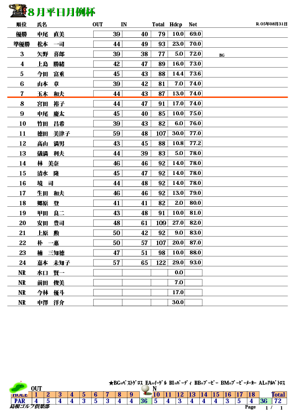 平日月例杯結果になります。